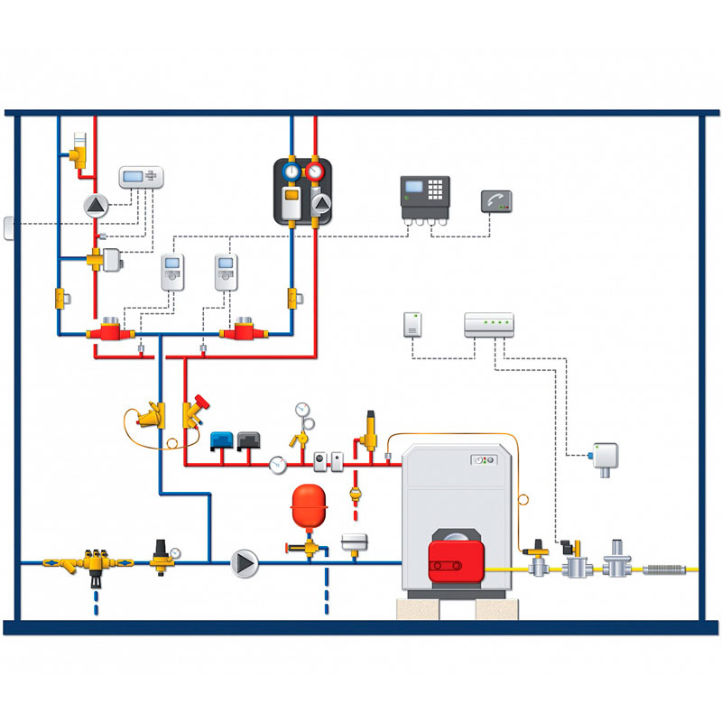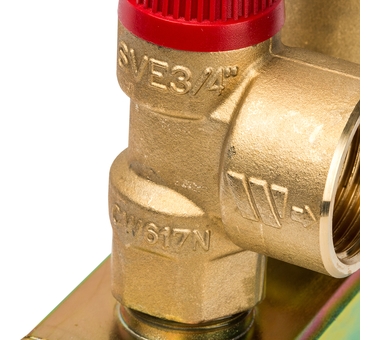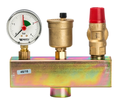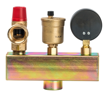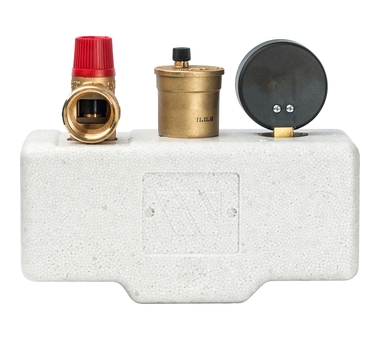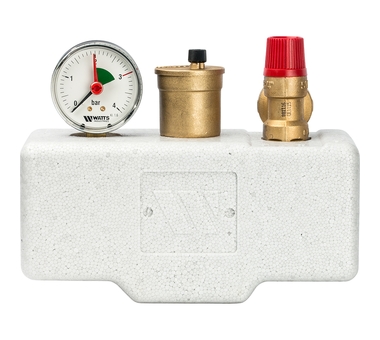 Группа безопасности котла для защиты закрытых систем отопления до 100 кВт. Включает в себя предохранительный клапан с порогом срабатывания 3 бара, автоматический воздухоотводчик (с запорным клапаном) MKV10R и манометр MHR6, установленные на стальной консоли (с гальваническим покрытием). Подключение 1" внутренняя резьба. Теплоизоляция, класс огнезащиты II, без хлорфторуглеродов (фреонов).